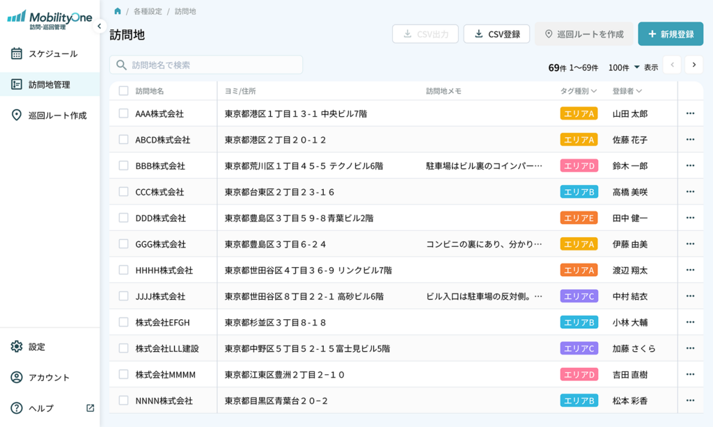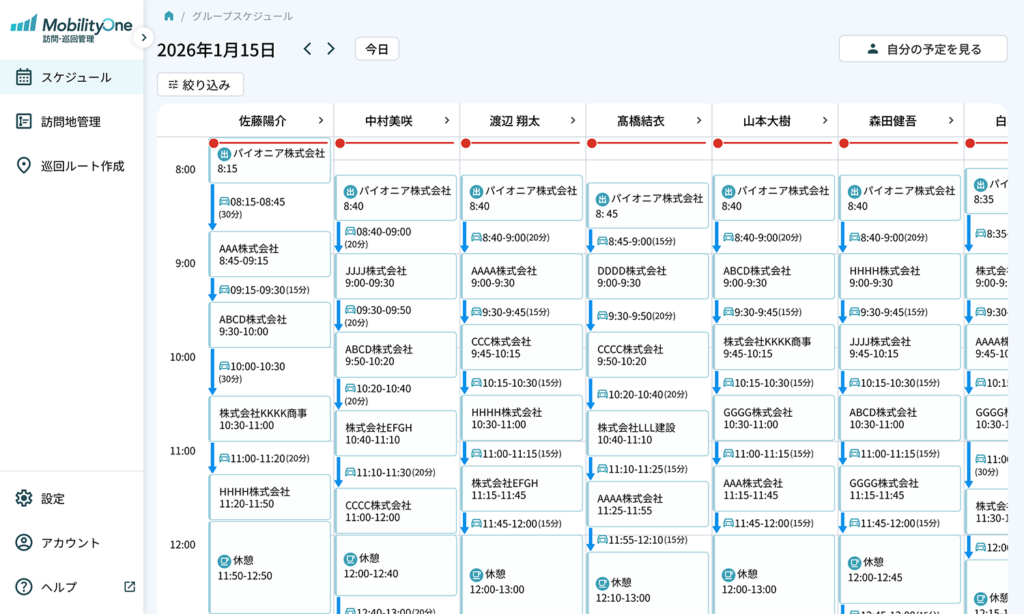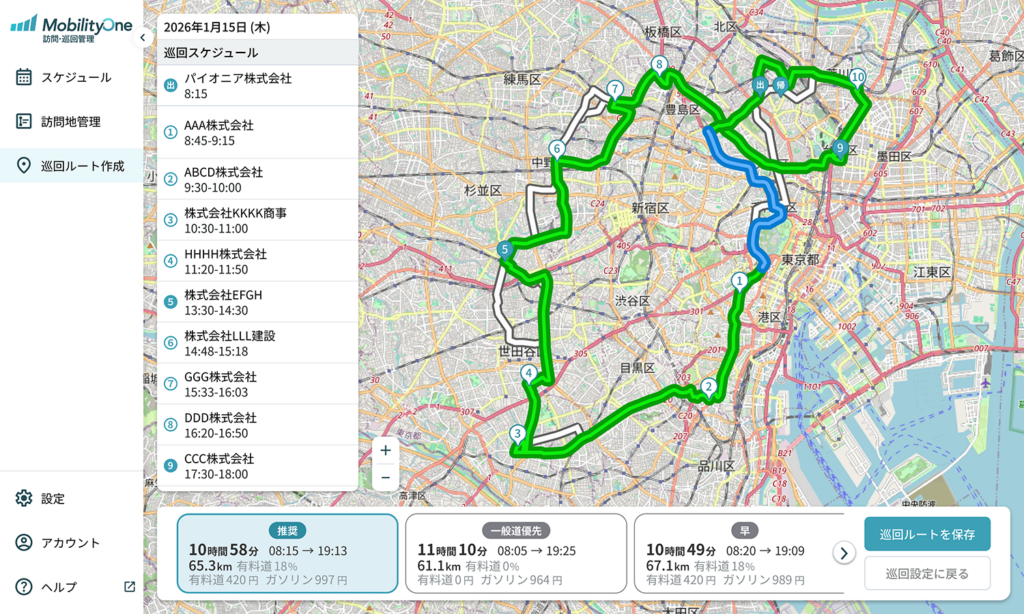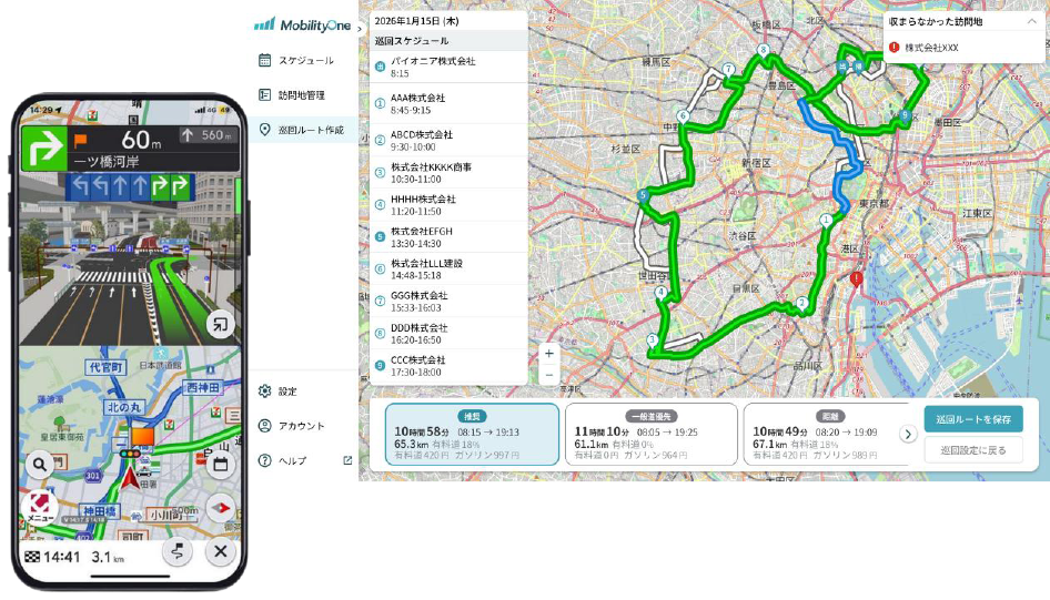 パイオニア MobilityOne 訪問・巡回管理 クルマでの訪問・巡回業務もっとシンプルにしませんか? 「MobilityOne 訪問・巡回管理」で こんなお悩みを解決 地図ソフトや表計算ソフトによる手作業での巡回ルート作成・調整が大変 一日に計画していた巡回数をこなせず、残業や休日対応、クレームが増えている 担当者によって巡回業務結果の差が大きい 従業員の離職率が高い 無理な業務予定のために焦って事故が起きている 突発業務に対するスケジュール調整が大変 「MobilityOne 訪問・巡回管理」を おすすめする方 こんな業種職種のお客様に ●メンテナンス・フィールドサービス業務電気 / ガス / 水道 / 通信インフラ / 設備保守 / リフォーム / 家電修理 / 自動販売機 / ビルメンテナンス / 飲食・小売・医療機器保守など●営業・SV業務不動産/ 金融・保険/ 訪問販売/ 店舗管理/ ラウンダー●廃棄物収集・処理業●医療・介護業 こんな課題の解決に ●ルート作成や予定変更に手間がかかる●突発対応でスケジュールが乱れやすい●担当者ごとに対応品質に差がある●人手不足で一人の負担が増えている●無理な運転で事故や疲労が心配 「MobilityOne 訪問・巡回管理」 主な機能 最適訪問・巡回ルート作成 複数箇所の訪問・巡回時に移動効率のよいルートを自動で作成。さらにスケジュールも最適化します。 スケジュール管理 各メンバーのスケジュールを一覧化でき、いつ・誰が・どこを回るのかも簡単に確認できます。突発業務が発生した際の代替要員の調整も簡単になります。 訪問地点管理 訪問・巡回地点を一括で取り込み、管理できます。訪問地に関するメモも共有できるので、次回訪問時の伝達事項もスムーズに。 ナビゲーションアプリ Webツールで作成したルートとスケジュールがスマートフォンアプリ上で確認でき、ワンプッシュでそのまま目的地まで案内してくれます。 訪問・巡回業務の生産性を向上! MobilityOne 訪問・巡回管理では、時間のかかる訪問・巡回ルート作成やスケジュール作成、訪問先管理業務を効率化。業務の生産性を向上させることができます。 1 訪問先選定 2 訪問・巡回・ルート作成 3 スケジュール作成・確認 4 訪問・巡回業務 5 訪問先管理 MobilityOne 訪問・巡回管理詳細はこちらへ お気軽にお問合せください CIテック株式会社 03-6715-7575 9:00~17:00(土日祝除く) メールでのお問合せ